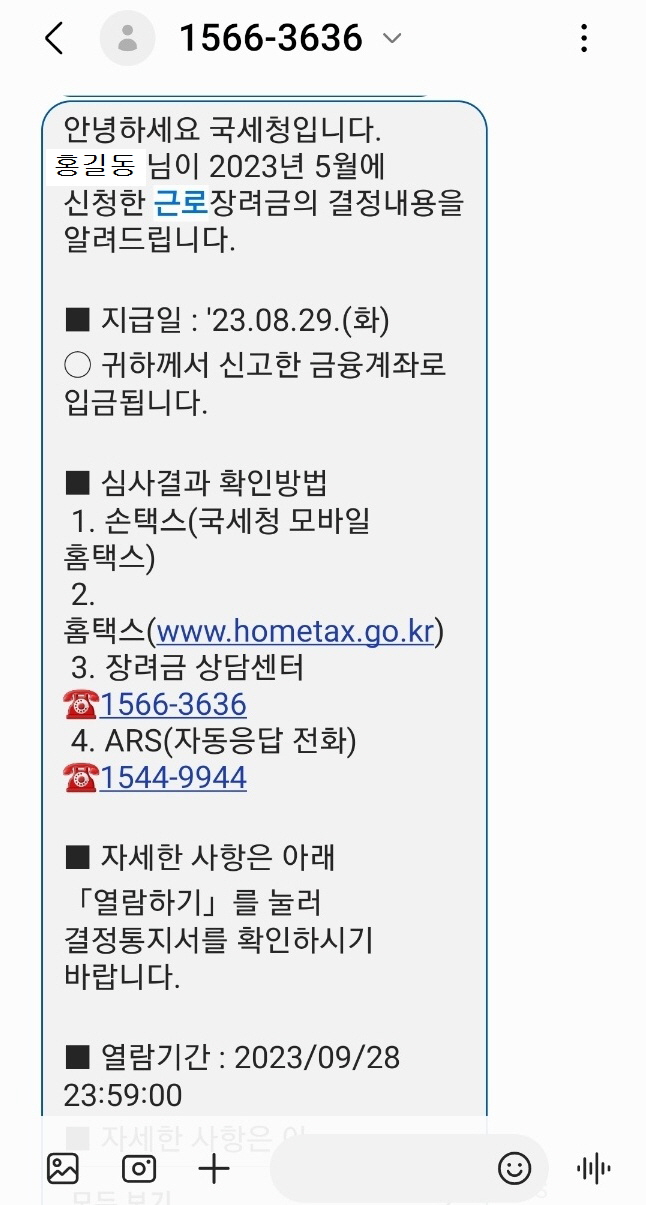 저는 자녀가 없기 때문에 근로장려금 정기신청을 하였는데요, 필요하신 신청방법을 선택하셔서 신청을 하시면 심사가 이루어지는데 시간이 어느정도 소요가 되어요. 심사가 끝나고 승인이 이루어지면 아래와 같이 문자가 오게 될 거에요.