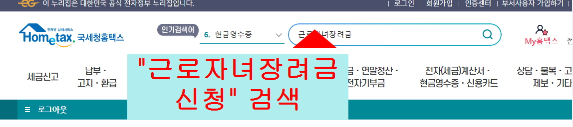 오른쪽 상단 검색란에 "근로장려금 신청" 이라고 검색하세요.