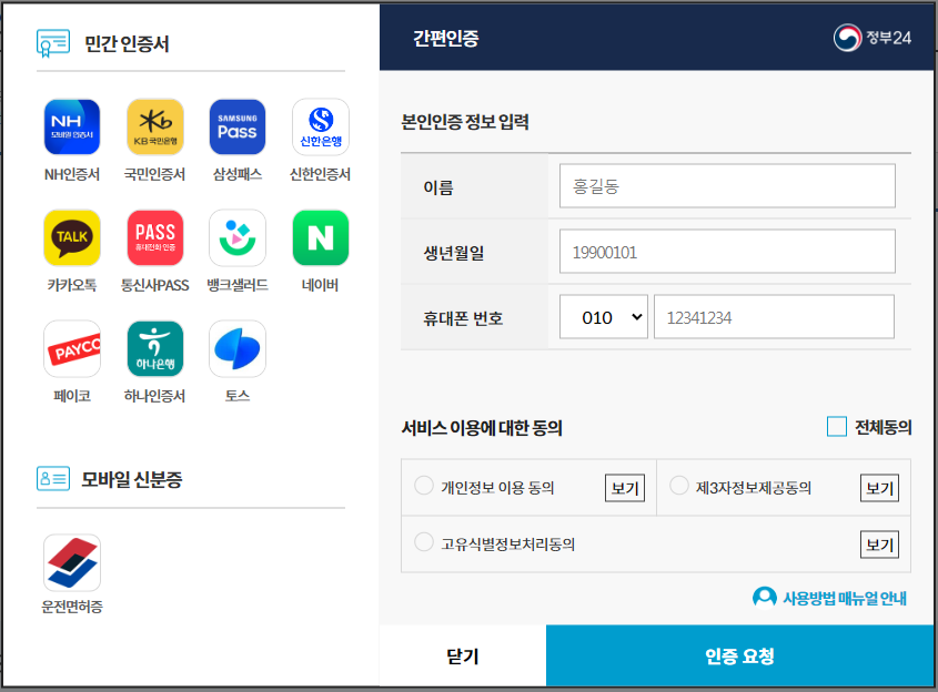 간편인증 혹은 공동*금융인증서가 필요합니다. 공동인증서 같은 경우는 전자서명을 생성하기 위하여 이용된 정보가 가입자에게 유일하게 속한다는 사실 등을 확인하고 이를 증명하는 전자적 정보로서 인증기관(Certification Authority)이 발행한 인증서를 말합니다. 공동인증서에는 가입자 이름, 공동인증서의 유효기간, 발급기관명, 가입자의 전자서명 검증정보, 전자서명 방식, 공동인증서 일련번호 등이 포함되어 있는데요, 금융기관의 인터넷 뱅킹 기반으로 은행 대면 확인 후 홈페이지서 발급가능합니다. 신분증 및 개설된 통장의 확인이 필요합니다. 있으신 분들은 오른쪽의 공동.금융인증서를, 없으신분들은 간편인증으로 들어가시면됩니다. 간편인증에서는 많이들 사용하시는 PASS인증이나 운전면허증 같은 방식으로 인증하시면 됩니다.