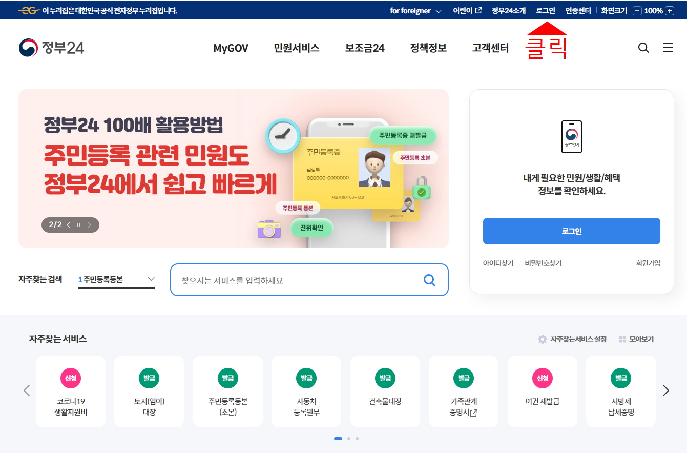 모든 준비가 되셨다면 아래와 같은 화면이 나오실텐데요. 앞서 말씀드린 정부에서 지원하는 코로나 생활지원비를 확인하기 위해서는 상단에 표시해둔 보조금24를 클릭하셔서 들어가셔야 해요.