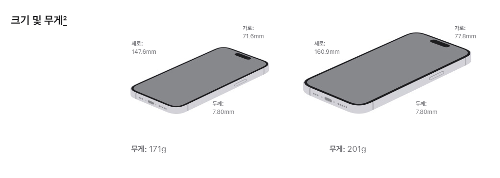 크기 및 무게 비교 ( 왼쪽 아이폰 14~15 / 오른쪽 아이폰 14~15 plus)