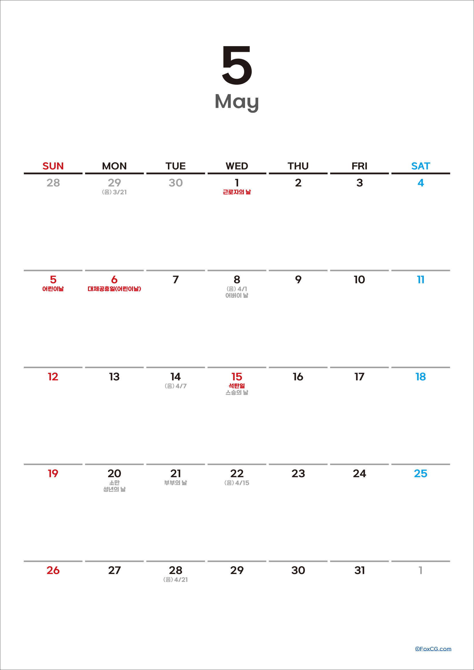 5월은 가정의 달이죠. 5월 1일 수요일은 "근로자의 날"이구요. 아이들을 위한 "어린이 날"이 5월 5일 일요일이기 때문에 다음 날 6일 월요일이 대체 공휴일로 지정되었습니다. 8일은 "어버이날", 10일 "유관자의 날"이자 "바다식목일", 11일 "동학농민혁명 기념일", 12일 "국제 간호사의 날", 15일은 "석탄일(부처님 오신 날)" 및 스승의 날로써 휴일입니다. 18일은 "5.18민주화운동기념일",19일은 "발명의 날", 20일 "세계인의 날"이자 "성년의 날", 21일 "부부의 날", 31일 "바다의 날", "세계 금연의 날" 이 있습니다. 마지막으로 재미있는 기념일이 있습니다. 14일이 옐로데이 & 로즈데이 (Yellow & Rose Day)인데요. 블랙데이까지 애인을 사귀지 못한 사람이 노란옷을 입고 카레를 먹어야 독신을 면한다는 옐로데이라는 기념일이 있습니다. 이에 해당하지 않는 연인들은 이 날은 로즈데이이기도 하기때문에, 장미 꽃과 함께 데이트를 떠나시면 됩니다.