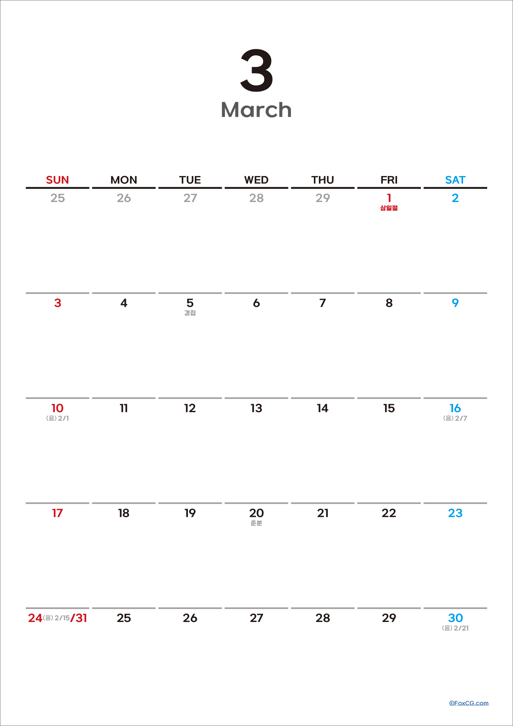 슬슬 봄이 오는 계절인데요. 3월 달에는 "삼일절(3월 1일)"이 금요일라 토, 일 붙여서 3일 연달아 쉴 수 있습니다. 8일은 "국제 여성"의 날과 3월8 "민주의거날", 14일은 유명한 "화이트데이 (White Day)" 가 있습니다. 이 날은 서양에는 없고, 동양에만 있는 독특한 기념일이라고 하죠. 20일 "상공의 날", 22일 "서해수호의 날", 23일 세계 모든 강아지들을 사랑하면서 보호하는 것은 물론 유기견 입양 문화를 정착시키자는 취지로 제정한 "국제 강아지의 날"도 있습니다.