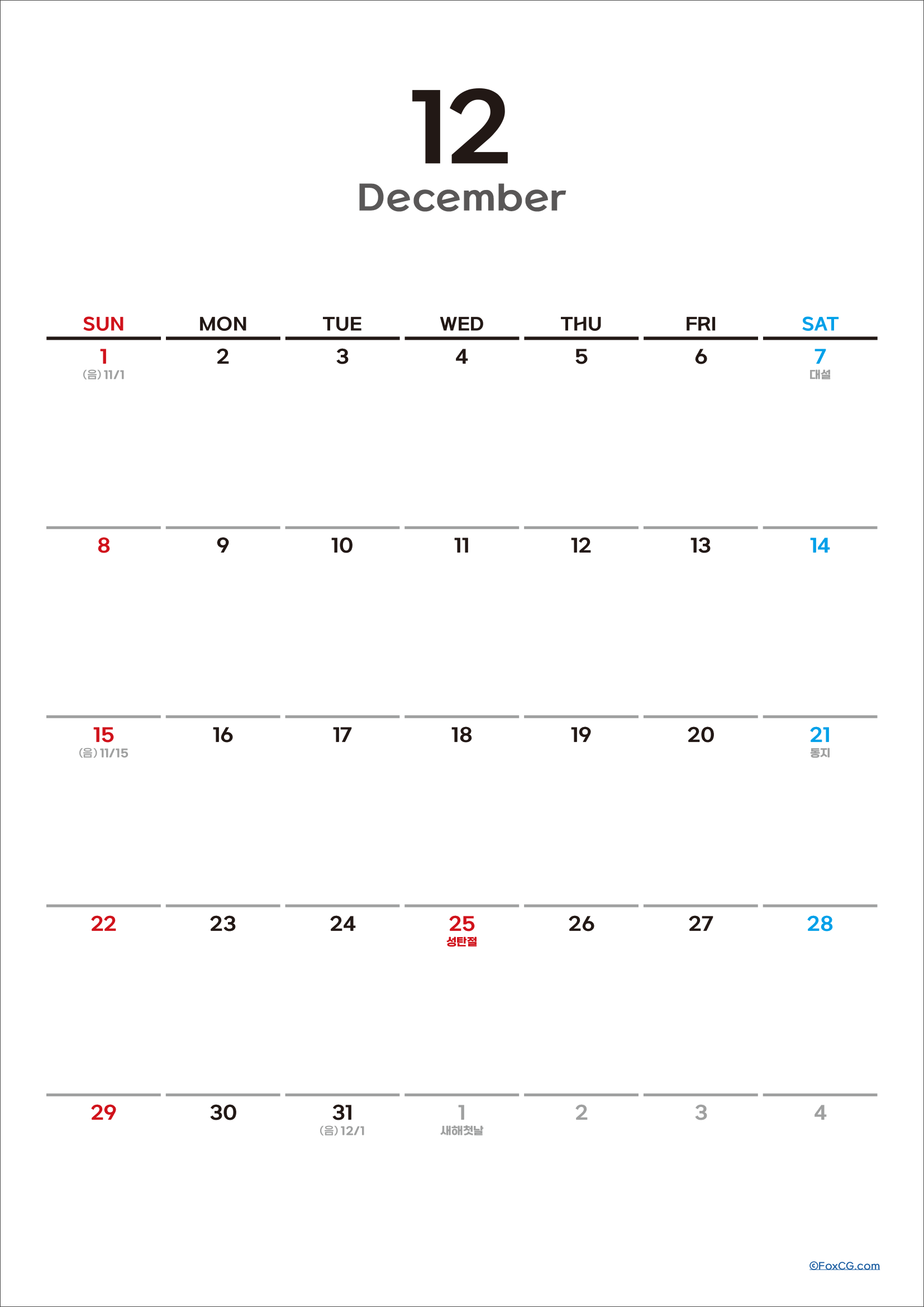 모두가 가장 정신없는 달이기도 하죠. 소중한 사람과 가족, 그리고 연인들과 함께 한 해를 마무리함과 동시에 새해를 맞이하는 달입니다. 이 달도 역시 여러 기념일들이 존재하는데요. 3일 "소비자의 날", 5일 "무역의 날", 14일은 허그데이&머니데이(Hug Day & Money Day)라고 합니다. 지금까지 있었던 14일의 기념일들 동안 쭈욱 잘 이어져 온 연인들끼리 추운 겨울에 서로 감사한 마음으로 따뜻하게 보낼 수 있는 날이기도 하고, 한 해를 무사히 사귀어온 것을 기념해서 용돈을 주는 기념일이라고 하네요. 그리고 12월 달하면 빠질 수 없는 25일 "성탄절"이 있죠. 역시나 공휴일이며 다행히도 수요일입니다. 27일은 "원자력의 날"입니다.